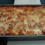 - Spread 1 1/2 cups of meat sauce in the bottom of a 9×13 inch baking dish.