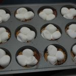 - Cut marshmallows in half. Place 3 marshmallow halves in each cup cake section.